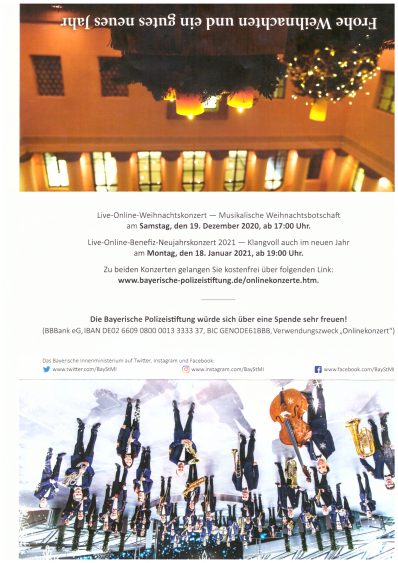 PS.: Weil das Neujahrskonzert des Polizeiorchesters Bayern nicht stattfinden kann, finden stattdessen zwei Live-Stream-Konzerte statt. Die Termine finden Sie im Anhang. Die Bayerische Polizeistiftung würde sich über eine Spende sehr freuen!
