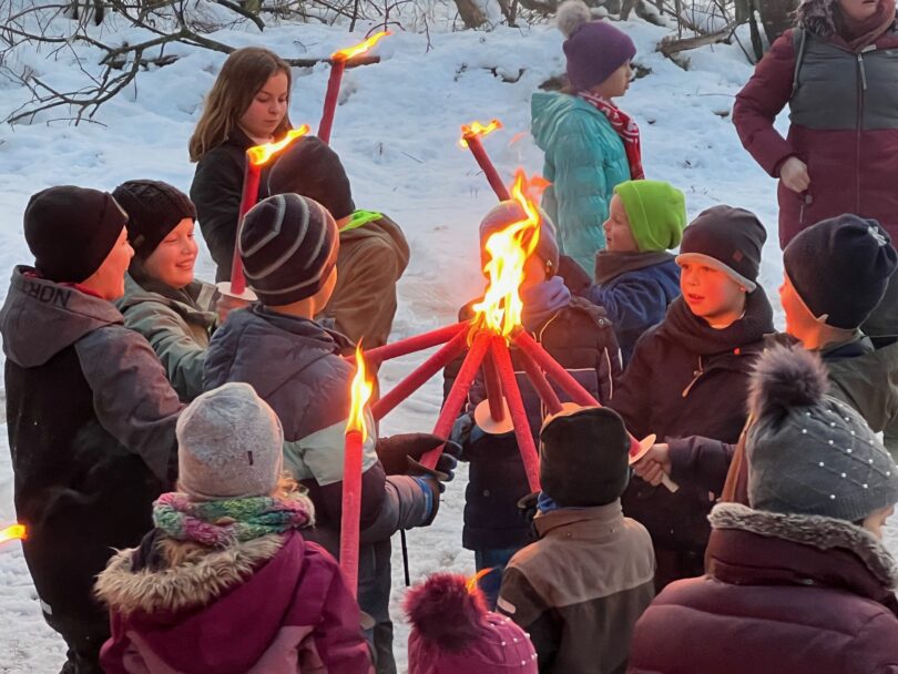 In der Feuerschale loderte schon das Feuer als die ersten Kinder eintrafen. Sofort stürzten sie sich auf den noch liegenden Schnee und es entstand eine fetzige Schneeballschlacht.