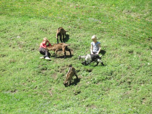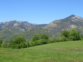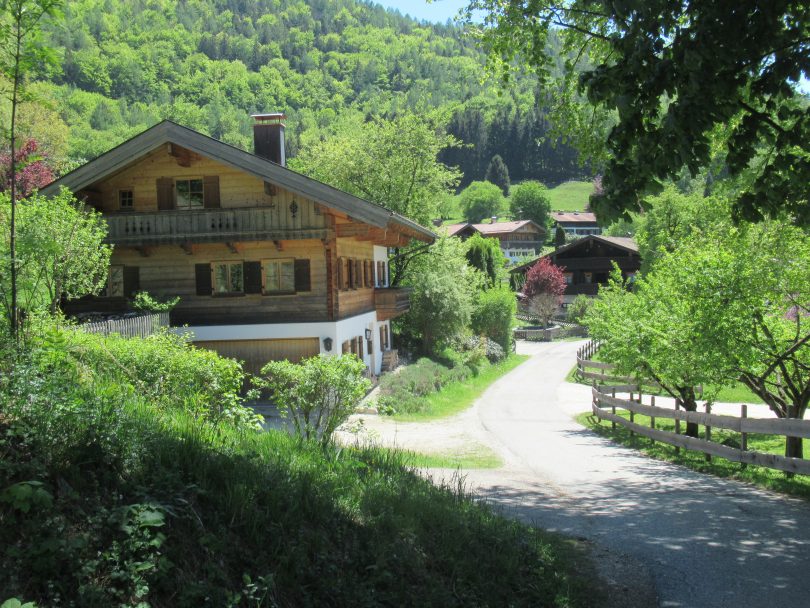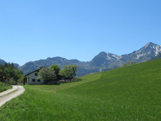 Aber wir hatten Glück, kein Gegenverkehr bis ans Ende der Bergstrecke.  Endlich kommen wir in flaches Gelände: eine saftige Wiese, vor uns das Ortsschild “Achberg” und freier Blick in die dahinter emporragenden Berge. Grandios stehen die schroffen Gipfelstöcke von Geigelstein und Breitenstein vor uns. Wir sind überwältigt, die Ängste bei der abenteuerlichen Bergfahrt sind vergessen. Auch der Weiler überrascht mit seiner idyllischen Lage, schön herausgeputzten Bauernhäusern und dem historischen alten Anwesen “Beim Unterauer”, einem früheren Urbarsgut des Herzogs.
