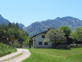 Auf zwar schmaler, aber geteerter Straße fahren wir dann weiter und kommen bald auf die gut ausgebaute Straße zur Streichenkirche, auf der es gemütlich hinunter ins Bergsteigerdorf Schleching geht.