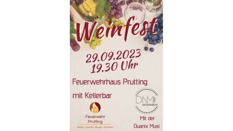 Die Freiwillige Feuerwehr Prutting lädt ein zum Weinfest am kommenden Freitag, 29. September 2023. Beginn ist um 19.30 Uhr, zur Unterhaltung spielt die Musikgruppe “Duanix Musi”.