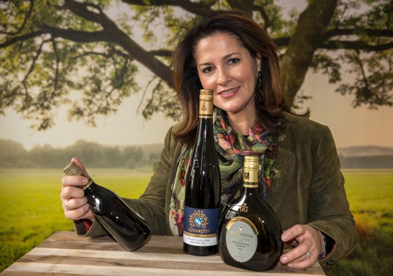 Foto: Pia Regnet/StMELF – Ministerin Michaela Kaniber mit Weinen vom „Würzburger Stein-Berg“ der drei großen Weingüter Würzburgs Juliusspital, Bürgerspital und Staatlicher Hofkeller l