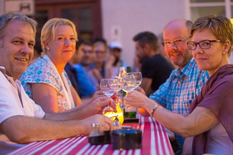 Aus der Tradition heraus sind es die Altstadtwirte, die das Weinfest ausrichten und seit einigen Jahren bei einer Blindverkostung gemeinsam die Festweine aussuchen. In diesem Jahr stammt der Weißwein, ein Pinot Grigio, aus Venetien. Mit Aromen von Birne und Aprikose schmeckt er angenehm leicht und intensiv fruchtig, ein idealer Sommerwein. Der Rotwein, ein sizilianischer Cabernet Sauvignon, ist faszinierend würzig und dank mäßigem Tannin auch angenehm trocken im Geschmack. Auffällig ist die Herkunft beider Weine – Italien, das Weinland 2017. Neben den Weinen haben die Altstadtwirte auch verschiedene italienische Köstlichkeiten im Angebot.