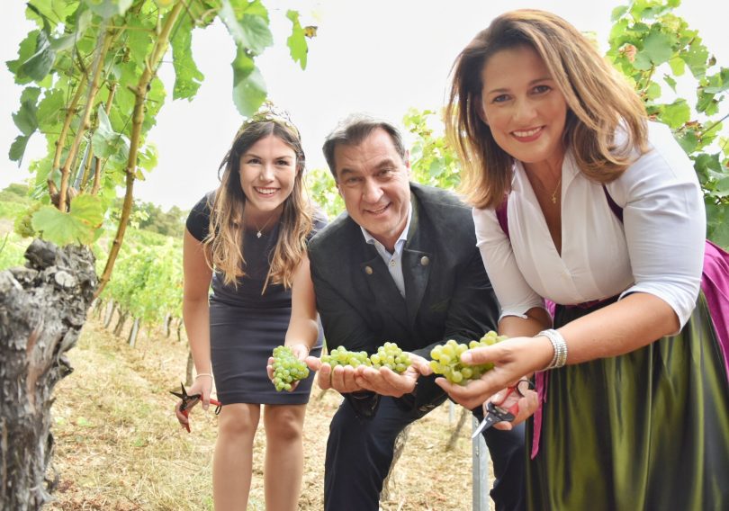 Ein paar kräftige Schnitte mit der Rebschere – und die Fränkische Weinlese 2019 kann beginnen. Ministerpräsident Dr. Markus Söder, Landwirtschaftsministerin Michaela Kaniber und Weinkönigin Carolin Meyer haben am Donnerstag im Thüngersberger Scharlachberg symbolisch die ersten Trauben des diesjährigen Jahrgangs geerntet. Ministerpräsident Dr. Markus Söder: „Frankenweine sind seit vielen Jahren nationale und internationale Champions – innovativ, anspruchsvoll und erstklassig in der Qualität. Die fränkischen Winzer leisten hervorragende Arbeit und produzieren eine einzigartige bayerische Spezialität, die als ,flüssiges Gold‘ weltweit für die wunderschöne Region Franken steht. Frankenwein ist exzellenter Genuss und Heimatliebe in Flaschen.“ Nach den Worten von Ministerin Kaniber erwarten die fränkischen Winzer aufgrund der großen Hitze im Juni und Juli einen sehr guten Jahrgang. „Die Liebhaber des Frankenweins können sich heuer auf besonders gehaltvolle und charakterstarke Weine freuen“, sagte die Ministerin. Ihr zufolge rechnen die Winzer in diesem Jahr mit einem Durchschnittsertrag von rund 80 Hektolitern pro Hektar.