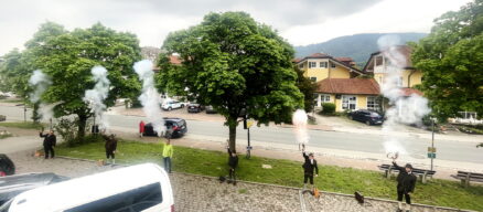 Geschichtsträchtiger hätte die Feier zum 80. Geburtstag von Bernaus Alt-Bürgermeister Klaus Daiber am 80. Jahrestag der Wiederkehr des Friedensbeginns nach dem Zweiten Weltkrieg nicht sein können. Gerade als zu Ehren des Jubilars die Bernauer Böllerschützen aus den Reihen der Schützengesellschaft „Eichet“ einen dreifachen Ehrensalut zum Besten gaben, da läuteten aus der nahen Pfarrkirche „St. Laurentius“ die Kirchenglocken. Der weiße Rauch, der von den fünf aktiven Böllerschützen aufstieg passte zeit- und symbolgenau auf den Weißen Rauch, der kurz zuvor in Rom anlässlich der abgeschlossenen Papst-Wahl in den Himmel entstieg.
