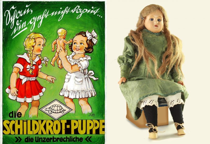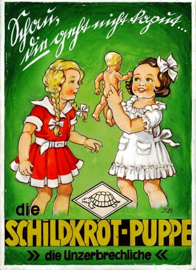 Puppen als Spielzeug oder Geschenk faszinieren seit mehreren Jahrhunderten. Oftmals waren in der frühen Zeit Körperteile nur verkleidet mit Textilien. Puppenköpfe wurden bei anspruchsvollen Spielzeug ab 1900 zum großen Teil aus Porzellan hergestellt. Dann gelang es einem deutschen Hersteller, dieses Bauteile aus Celluloid zu formen. Das hatte den großen Vorteil: der Kopf war so unzerbrechlich wie der Panzer einer Schildkröte. Und die Herstellung war erheblich günstiger. Arme und Beine konnten in einer lebensechten Form und Hautfarbe hergestellt werden. Eine Idee war geboren: „Wir nennen unser Produkt Schildkröt-Puppe!“. Das Material war so stabil wie der Panzer einer Schildkröte. Gesagt getan, ein Welterfolg . Das gesetzliche Warenzeichen, die „Schildkröte“, wurde im Kaiserlichen Patentamt in Berlin eingetragen.