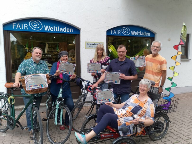 Im Anschluss an die bundesweite Initiative „Stadtradeln – Prien radelt!“ setzt die Fairtrade-Gemeinde Prien a. Chiemsee gemeinsam mit dem Weltladen ein Zeichen für die Bedeutung des Fairen Handels. Fairness sollte sowohl im Verkehr als auch im Handel wegweisend sein. Mit einer Fahrradkorb-Aktion will der Priener Weltladen durch an Fahrrädern angebrachten, mobilen Wegweisern auf seine ein wenig versteckte Lage im Ortszentrum aufmerksam machen.