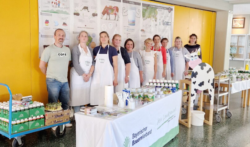 „Wusstet ihr, dass die Lebensmittel aus unserer heimischen Landwirtschaft die beste Klimabilanz erzielen?“ Dazu erklären die Bäuerinnen die Zusammenhänge der regionalen Kreislaufwirtschaft und den Beitrag der Landwirtschaft zur Artenvielfalt anhand eines großen Plakates. „Aber Achtung! Pflanzendrinks aus Mandeln und Soja sind nicht vergleichbar mit Milch. Diese werden oft weit transportiert und mit viel mehr Produktionsschritten unter der Beigabe von Zusätzen erzeugt.“, so die Landfrauen weiter. Während noch ein paar Schüler das Melken an dem mitgebrachten Euter versuchen, tauschen sich die Lehrer über Hofbesuche mit Ihren Klassen im Programm Alltagskompetenzen mit Landwirtschaft in der Schule mit den Bäuerinnen aus. „Ich freue mich riesig über diese tolle Aktion. Wir bedanken uns ganz herzlich bei den Landfrauen für Ihren Einsatz und beim Verband der Milcherzeuger Bayern für die Milchprodukte. Das Projekt Alltagkompetenzen ist bereits fest in unser Schulprogramm installiert, wo wir die Zusammenarbeit mit unseren Landwirtsfamilien auch immer sehr schätzen.“ so die stellvertretende Schulleitung Daniela Heß.