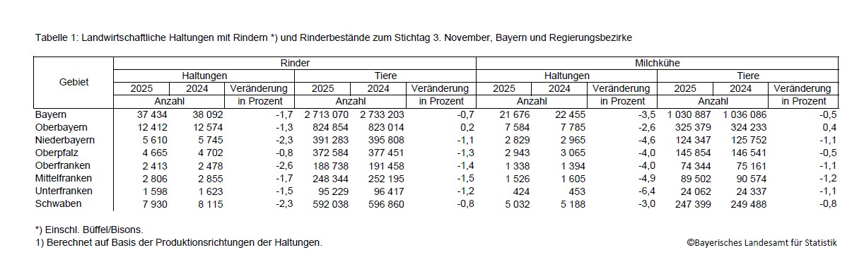 Fürth. Zum Stichtag 3. November 2025 weist das Fachteam des Bayerischen Landesamts für Statistik durch eine Auswertung des Verwaltungsverfahrens „Herkunftssicherungs- und Informationssystem Tier (HIT)“ 2 713 070 Rinder in 37 434 Haltungen nach. 2024 wurden noch 2 733 203 Tiere in 38 092 Rinderhaltungen gezählt. Ergänzend zur bayernweiten Auswertung veröffentlichen die Statistiker regionale Zahlen.