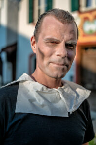 Wenn das Gold das Sagen hat … Mit goldglänzendem Körper, dicker Rolex-Kette und überheblichem Grinsen thront „Mammon“ (Markus Leitner) auf dem gekrümmten Rücken von „Jedermann“ (Bernd Eutermoser) – eine Szene, die ebenso grotesk wie entlarvend wirkt. Sie zeigt, wie sehr sich der Mensch dem Reichtum unterwirft, wie tief er sich beugt, wenn das Geld das Sagen hat. Die Inszenierung des „Bayerischen Jedermann“ auf dem Neubeurer Marktplatz spart nicht an drastischen Bildern – und genau das macht ihre Kraft aus. Mit bissigem Humor und scharfer Symbolik bringt das Ensemble die großen Fragen von Leben, Tod und moralischem Verfall mitten ins Hier und Jetzt. Markus Leitner überzeugt als überzeichnet materialistischer Mammon ebenso wie Bernd Eutermoser als innerlich zerrissener Jedermann – ein fesselndes Spiel zwischen Abhängigkeit und Selbsterkenntnis.