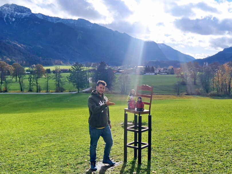 Wie man sich täuschen kann: die Kleinen auf diesem Bild sind genau so groß wie der Große – möglich ist dieses Spiel mit Perspektive und Kamera beim Cafe Pauli in Aschau-Höhenberg.