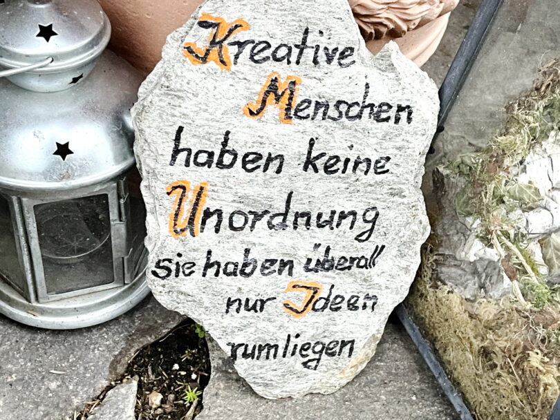 Ein Motto, das für viele Leute Hoffnung macht, entdeckten wir bei einem Spaziergang im Westen der Gemeinde Prien – da heißt es: “Kreative Menschen haben keine Unordnung – sie haben überall nur Ideen rumliegen!”.