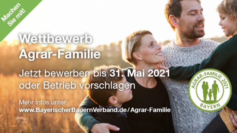 „Machen Sie mit beim Wettbewerb Agrar-Familie 2021. Zeigen Sie uns Ihre Talente und Stärken, wie Sie gemeinsam mit Ihrer Familie Zukunft gestalten. Lassen Sie uns teilhaben an Ihren Ideen“, sagt Georg Wimmer, Generalsekretär des Bayerischen Bauernverbandes. Mitmachen lohnt sich, es winken Preise im Gesamtwert von 10.000 Euro.