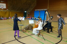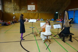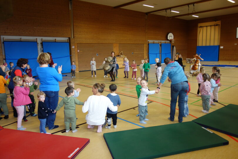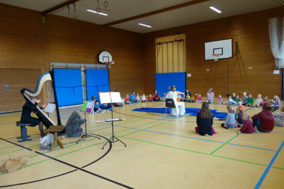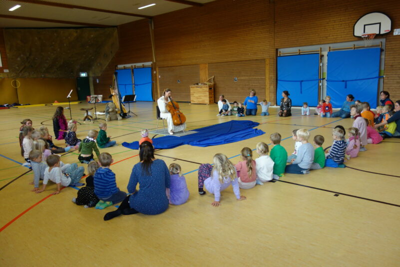 Hören, Sehen, Fühlen und Bewegen waren angesagt. Durch den regelmäßigen Wechsel von Perspektive, Ausdrucksform und Bewegung in der Turnhalle waren auch die kleineren Kindergartenkinder in der Lage, ihre Konzentration für das 45-minütige Konzert aufrechtzuerhalten. Die Kinder erlebten Musik mit allen Sinnen und in Verbindung mit Bewegung, Sprache und Tanz, so zum Beispiel auch der „Tanz der Frösche“. Am Ende hatten sie dann viele schöne Töne in der Landschaft gefunden und bekamen von den Protagonistinnen ein dickes Lob dafür, dass sie so ein „super Publikum“ gewesen seien.