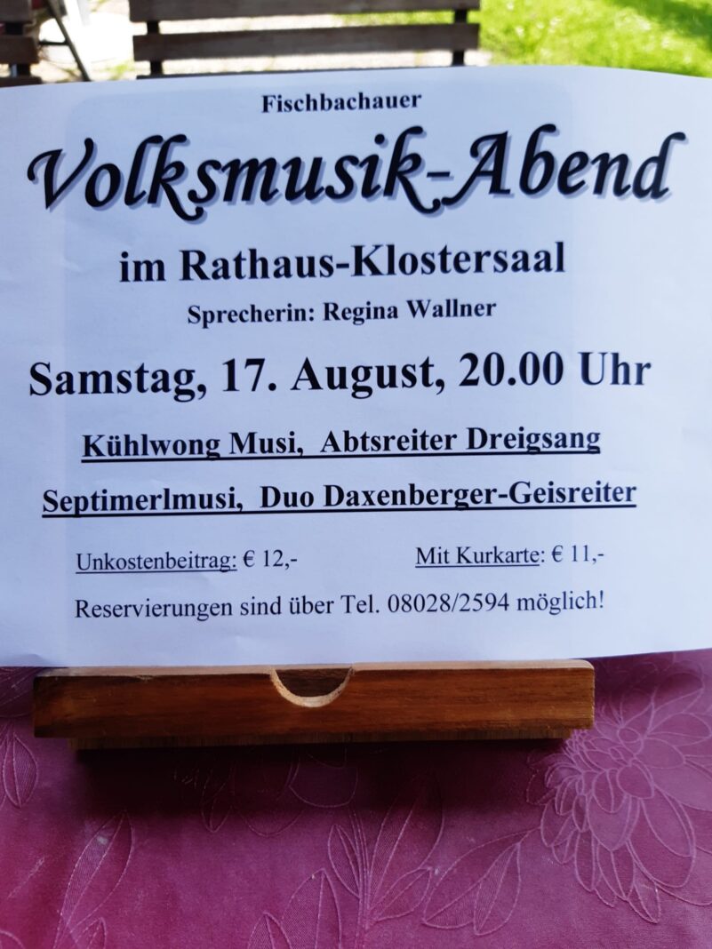 Am Samstag, 17. August gibt es wieder einen Volksmusik-Abend im Rathaus-Klostersaal der Gemeinde Fischbachau im Leitzachtal.