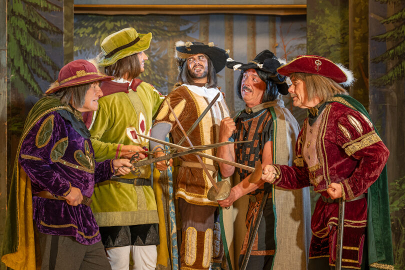 Bericht: Volkhard Steffenhagen – Foto: Monika Keiler – Spannung im Wald – Szene aus „Ulrika oder Die Entscheidung um Mitternacht“ – Fünf Männer in prächtigen historischen Gewändern zeigen sich entschlossen: Mit gezückten Schwertern, entschlossenen Blicken und theatralischer Gestik entlädt sich die Konfliktlage des Stücks mitten im Bühnenwald der Kiefersfeldener Comedihütte – eine Szene zwischen Drohung, Übermut und Komik.