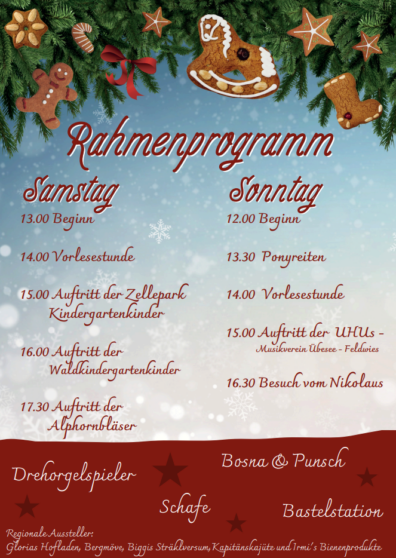 Vor Ort findet man zudem einen Drehorgelspieler, Schafe und eine Bastelstation. Einige Programmhighlights sind die Auftritte der Kindergartenkinder, die Vorlesestunden, ein Ponyreiten, der Besuch des Nikolaus und musikalische Auftritte der Alphornbläser und der „UHUs“ des Musikvereins Übersee-Feldwies.