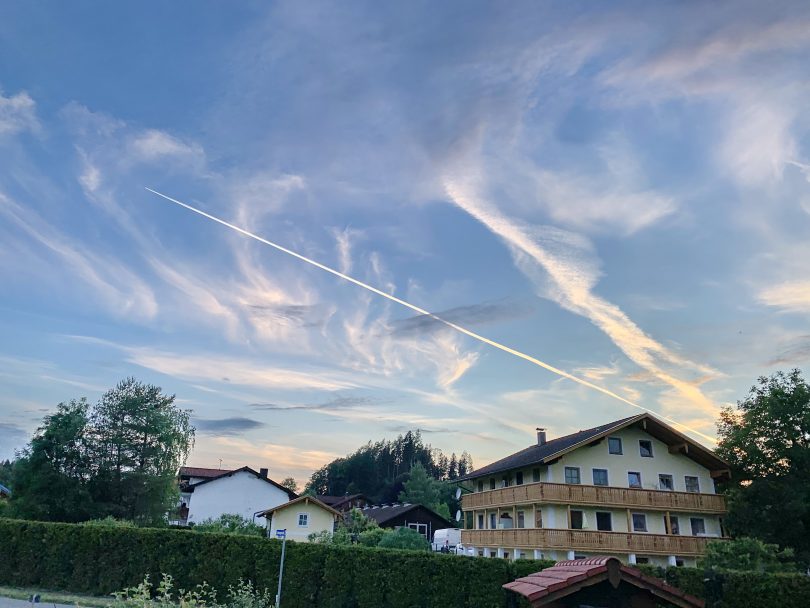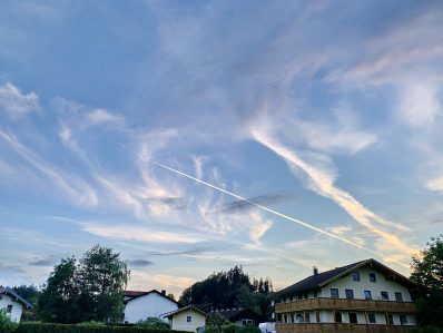 Wochenlang waren keine Flugzeuge bzw. deren Kondensstreifen am Chiemgauer Himmel zu sehen. Mit den schrittweisen Corona-Lockerungen ändert sich auch das Bild am Firmament – wie diese aktuelle Aufnahme von Prien-Bachham mit einem geraden Strich zwischen einem ansonsten lockeren Wolkengebilde.