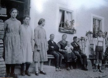 - Konrad rechts in Röselsberg: Dirsch (Loferer) Katharina, Loferer Anna (Dirn beim Lederer in Aschau, daher Lederer Nanni), Loferer Theresa, Loferer Josef (Opa v. Rita), Loferer Anna, Josef Loferer (Papa v. Rita), Reisböck Konrad