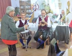 Eine der Aufnahmen, die Konrad gemacht und mitgebracht hatte, zeigt Rita Aicher als junges Dirndl daheim in Röselsberg bei der Pferdepflege, eine andere Aufnahme zeigt ihn als Dirigent der Kiefersfeldener Musikkapelle, die zu seinem 85. Geburtstag nach Rottmoos kam. Die Kiefersfeldener haben Konrad ebenso wie die Wasserburger Stadtkapelle in all den Jahrzehnten besonders lieb gewonnen, denn er machte sich bei deren Auftritten immer wieder positiv bemerkbar. Als Dirigent bewies er sein musikalisches Talent. Trotz seiner Behinderungen wurde er Freund der Blaskapellen, dies auch besonders gerne auf dem Rosenheimer Herbstfest. „Dabei lernte ich auch die sympathische Oberbürgermeisterin Gabriele Bauer kennen“ – erklärte Konrad in gebrochener Sprache. Beim Album-Blättern zeigt er mit Stolz seine Bildererinnerungen an einen Ski-Kurs im Jahr 1959 mit einer Taubstummengemeinschaft im Allgäu. An Berufskraftfahrer Peter Loferer, der vor kurzem seinen 80. Geburtstag feiern konnte, Konrad damit nicht von seinem Kindheits-Aufenthalt, sondern von einigen späteren Besuchen her kannte, bezeichnete er in einem seiner Briefe als Fernlast-Pilot.