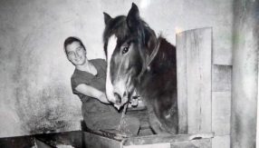 - Rita Aicher (geb. Loferer) bei der Pferdepflege
