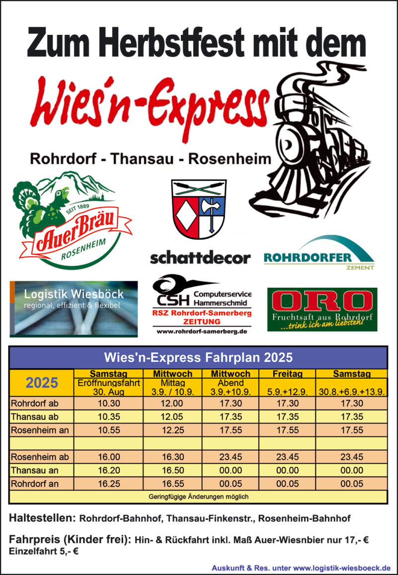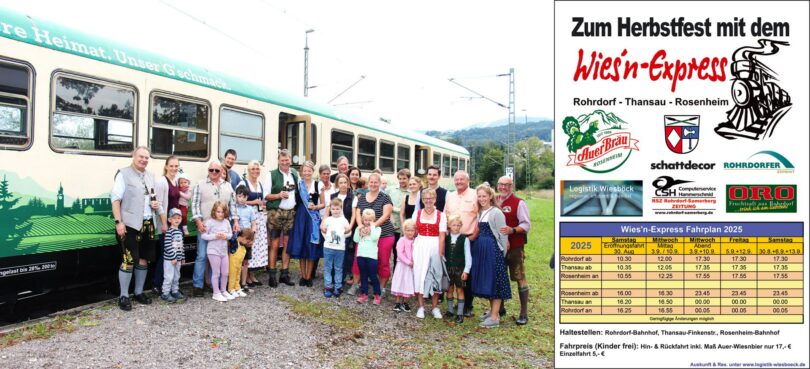 Auch heuer bringt der beliebte Rohrdorfer Wiesnexpress wieder Fahrgäste von Rohrdorf über Thansau nach Rosenheim. Auf der sonst nur für Güterverkehre benutzten Gleisstrecke stellt die historische Diesellok V 60 Baujahr 1959 und der einzigartige Personenwagen Esslinger VB 223 Baujahr 1958, seit 2010 im speziellen Auerbräu Wiesn-Look, einen musealen bzw. historischen Verkehr dar und ist somit keine Konkurrenz zum öffentlichen Personennahverkehr (ÖPNV).