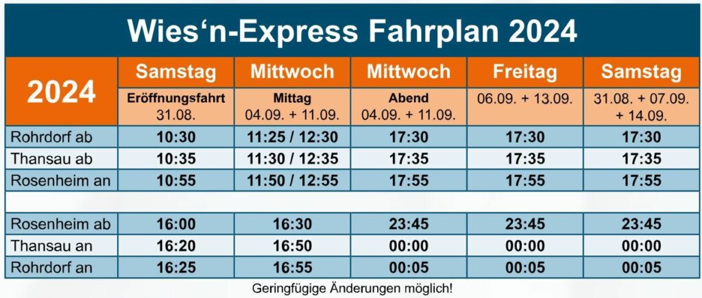 Ein besonderes Highlight für die lokale Bevölkerung: Dank der großzügigen Unterstützung von Unternehmen wie Rohrdorfer Zement, Schattdecor, der Obstverwertung Rohrdorf (ORO), dem Gewerbeverband Rohrdorf-Samerberg und Auerbräu Rosenheim können die Bürger von Rohrdorf und Umgebung kostenlose Fahrten mit dem Wiesn-Express genießen. Die Gemeinde Rohrdorf lädt zudem an den beiden Familientagen mittwochs, dem 4. September um 11.25 Uhr und dem 11. September um 12.30 Uhr, alle Familien mit Kindern und Gäste zu einer Freifahrt ein. Darüber hinaus werden weitere Freifahrten von den Sponsoren des Wiesn-Expresses angeboten.