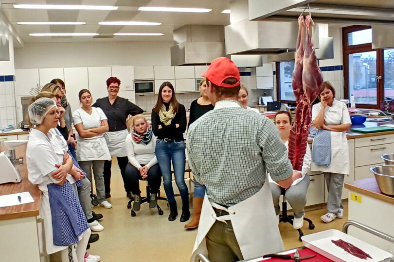 Bericht und Foto: Amt für Landwirtschaft – Die Studierenden der Hauswirtschaftsschule lernen von Berufsjäger Anton Hebensteiner das fachgerechte Zerlegen eines erlegten Rehes