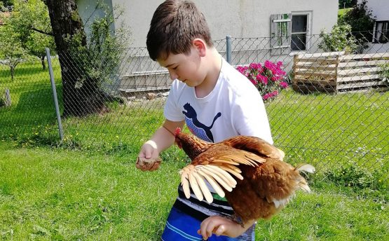 „Lisa, Susi, Adele, Berta, Cilly komm komm komm“, flügelschlagend läuft, rennt und stolpert ein Dutzend braune Hühner daher, ein Pfiff hat sie aus ihrer Ruhe aufgeschreckt. Sie verlassen ihre Sandbäder und ihren Unterstand unterm großen Apfelbaum und versammeln sich rund um Florian, der da gepfiffen hat. Der 13-jährige hat ihnen ein paar Leckerbissen mitgebracht, ein paar Brocken Brot – stibitzt aus Omas Speisekammer – und eine Handvoll Sonnenblumenkerne, langsam hockt er sich nieder. Er kennt jede einzelne von den zwölf Hühnern: „das ist die Lisa, das ist die Gescheiteste von allen, das ist Adele, die ist immer hungrig, das ist die Susi, dahinten kommen Hanni und Nanni, die beiden gesperberten, die sind ein bisschen scheu. Alle zwölf haben ein anderes Gesicht, haben einen anderen Schnabel und einen anderen Kamm, oder sie tragen ihre Federn anders, man kann sie ganz leicht voneinander unterscheiden“. Er bleibt in der Hocke und ohne zu zögern springt ihm Lisa aus dem Stand auf den Unterarm und pickt die Sonnenblumenkerne aus der anderen Hand, die anderen elf drängen sich um die Knie und wollen auch etwas. Lediglich Hannibal der Hahn hält sich etwas abseits, ihm ist nicht ganz geheuer, was seine Damen mit dem Buben alles machen.