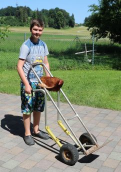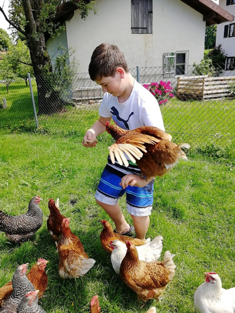 „Wir haben vor Kurzem die Zeit der Ritter in der Schule durchgenommen, dabei ging es beim Leben der Ritter im Mittelalter auch um die Jagd mit den Jagdfalken. Da habe ich mir gedacht, was die Adler und Falken konnten, das können unsere Hühner auch“. Ein Besuch bei der Greifvogelschau in Hohenaschau bestärkte ihn in seinem Vorhaben die Hühner abzurichten. „Natürlich werden aus bayerischen Bauern-Hühnern keine mittelalterliche Jagdfalken, aber schon, dass sie auf Pfiff kommen, dass sie auf den Arm springen und sitzenbleiben und dass sie aus der Hand fressen – das ist schon ein Erfolg. Man braucht einfach viel Zeit und viele Leckerlis als Belohnung, dann machen auch alle mit“. Wie bei den Kindern in der Schule gebe es auch auf dem Hühnerhof lauter verschiedene Individuen. Da ist die gescheite Lisa, die nach kürzester Zeit alles begriffen hat, was Florian von ihr will. Sie springt auf den Arm und bleibt auch längere Zeit sitzen, da ist die verträumte Berta, der die anderen das Brot sogar noch vom Schnabel wegfressen, da ist die schnelle Cilly, die immer als erste rauskommt, wenn er in der Frühe den Hühnerstall öffnet, und da sind Hanni und Nanni, die beiden unzertrennlichen gesperberten.