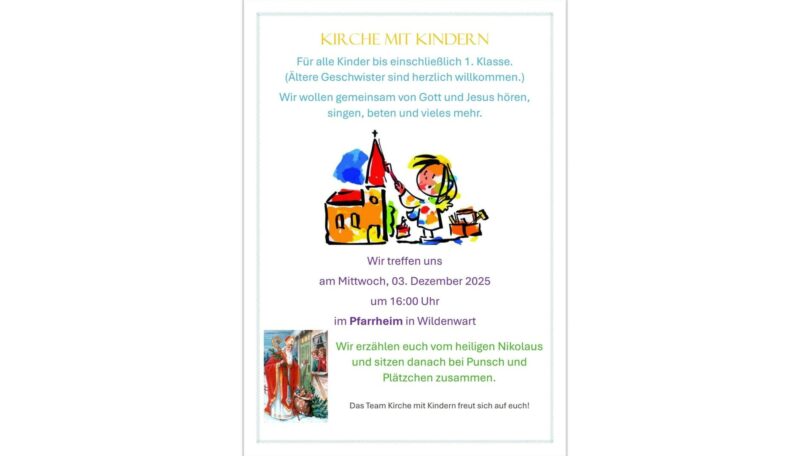Die Veranstaltung beginnt um 16:00 Uhr im Pfarrheim Wildenwart. Gemeinsam wollen die Kinder von Gott und Jesus hören, singen, beten und miteinander Zeit verbringen. Passend zur Adventszeit wird an diesem Tag die Geschichte vom heiligen Nikolaus im Mittelpunkt stehen.