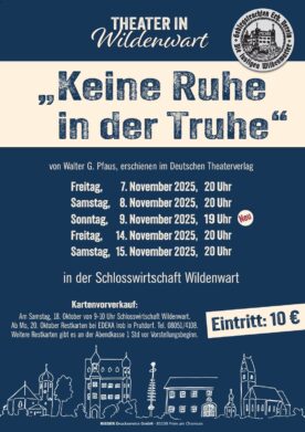 Das Stück „Keine Ruhe in der Truhe“ stammt von Walter G. Pfaus und ist im Deutschen Theaterverlag erschienen. Aufgrund der bisherigen stets gewachsenen Nachfragen für die Theatervorstellungen in Wildenwart gibt es heuer erstmals fünf Aufführungsabende, diese sind am Freitag, 7. November, am Samstag, 8. November, am Freitag, 14. November und am Samstag, 15. November jeweils ab 20 Uhr. Neu ist eine weitere Aufführung am Sonntag, 9. November bereits ab 19 Uhr. Der Kartenvorverkauf für alle fünf Veranstaltungen beginnt am Samstag, 18. Oktober von 9 Uhr bis 10 Uhr in der Schlosswirtschaft. Weitere Karten sind dann ab Montag, 20. Oktober bei EDEKA Irob in Prutdorf, Telefon 08051-4108 erhältlich. Restkarten sind dann auch noch an den Veranstaltungsabenden eine Stunde vor Vorstellungsbeginn zu bekommen.