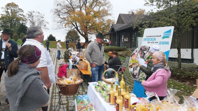 Zwergerl- und Jugendkapelle (beide unter der Leitung von Eva-Maria Gruber) spielten vor dem Eingang der Wildenwarter Schule ehe auch noch die Erwachsenen-Kapelle nach ihrem Trachtler-Jahrtags-Einsatz kam und so die Ausstellungs- und Bewirtungs-Angebote ergänzte. Hoch zufrieden zeigte sich Kathi Schmid vom Chiemgauer Helferkreis für die Erzdiözese Ternopil in der Ukraine. „Damit wir einen schönen Beitrag für den Wildenwarter Herbstmarkt hatten, trafen sich acht Mitglieder unseres Vereins für einen Tag zum Basteln von Türkränzen, nun freut es uns, dass diese gefallen, gekauft und somit für die Hilfe zum Einsatz kommen“.