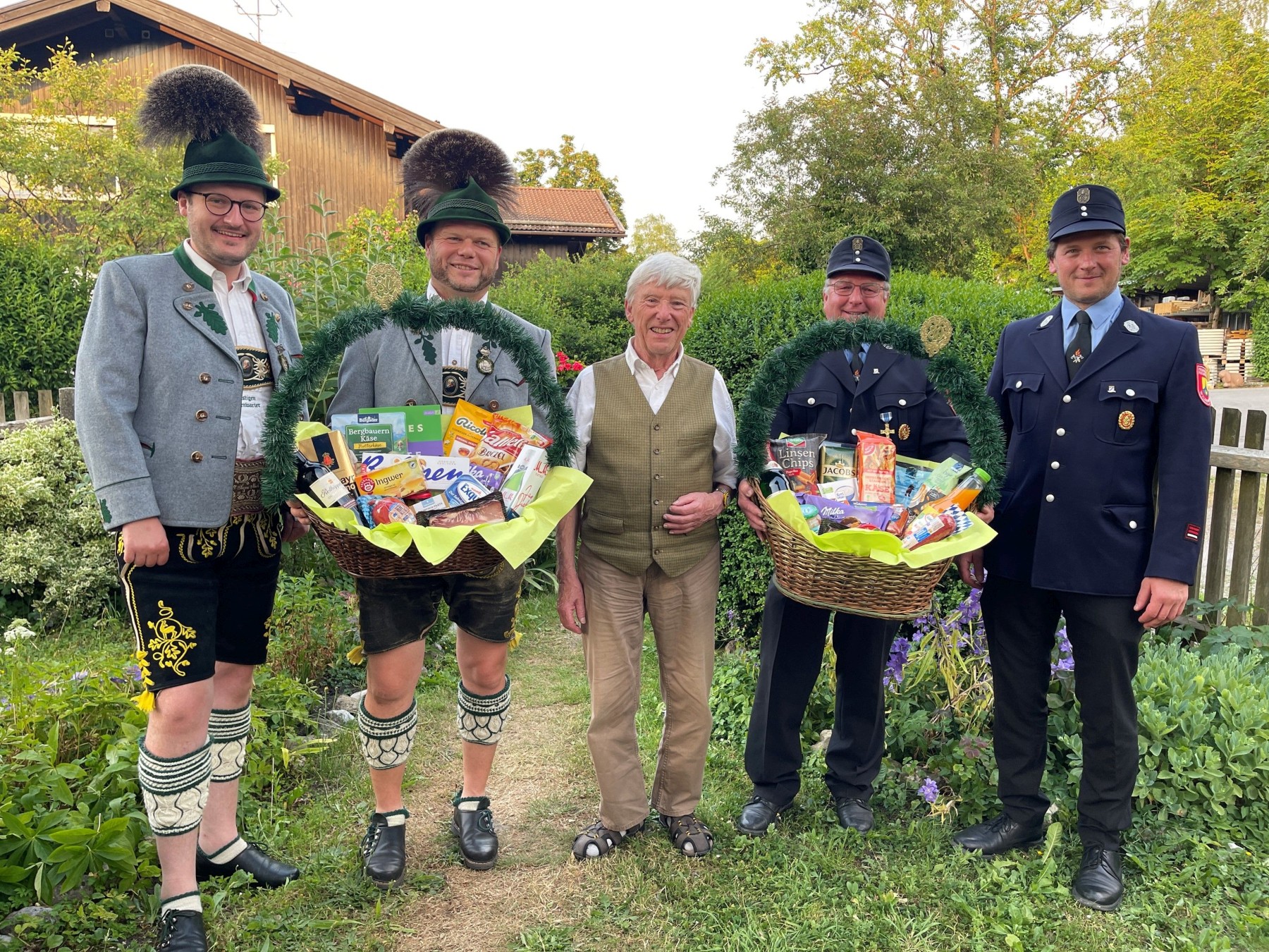 Die beiden stellvertretenden Vorsitzenden des Trachtenvereins „Die lustigen Wildenwarter“ Helmut Freund und Florian Stoib und die Vorsitzenden der Feuerwehr Fred Vodermaier und Michael Ramsl (von links) gratulieren Altbürgermeister Benno Voggenauer (Mitte) zum 80. Geburtstag