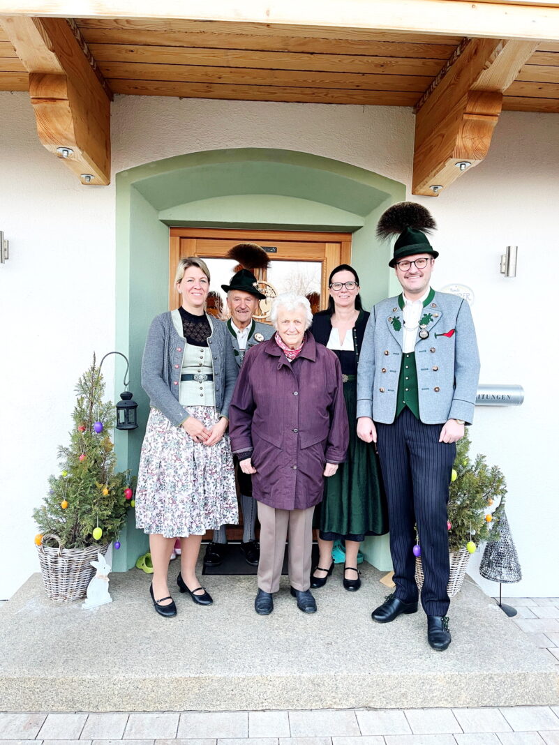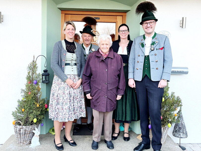 Mit 95 Jahren darf man auf einen ereignisreichen Lebenslauf zurückblicken, der neben vielen schönen Momenten mit Sicherheit auch von schweren Zeiten und vor allem einem entsprechenden Arbeitspensum am Schmied-Hof in Wildenwart geprägt war. So war es für 1. Trachtenvorstand Helmut Freund, Ehrenvorstand Anderl Freund, Stellv. Trachtenvorständin Sabine Till und Röckifrauenvertreterin Regina Rupp eine besondere Ehre, einen reichlich gefüllten Geschenkkorb zu überreichen und sich im Anschluss mit der Jubilarin über viele Anekdoten aus der Zeit der langjährigen Vereinszugehörigkeit auszutauschen.