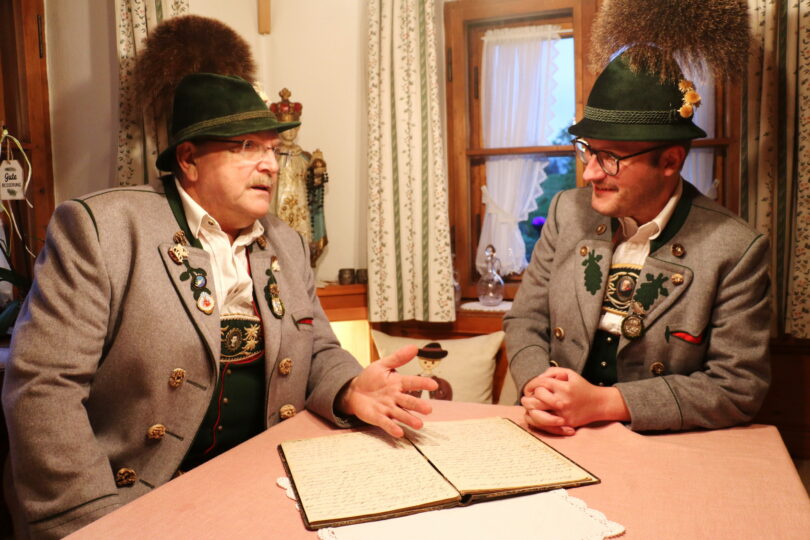 Der Vorsitzende des GTEV „Die Lustigen Wildenwarter“ Helmut Freund und sein Vorgänger Peter Voggenauer begutachten das erste Protokollbuch des Vereins, das jahrzehntelang verschollen war.