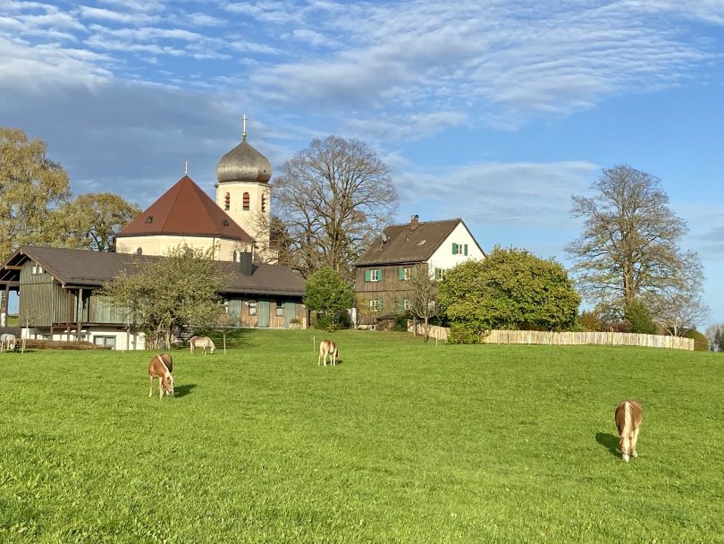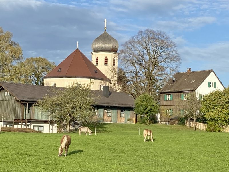 Der Chiemgau zeigt sich in diesen Herbsttagen immer wieder von seiner schönsten Seite – so wie in Wildenwart, wenn um die auf einem Hügel erbaute Pfarrkirche “Christkönig” die Pferde grasen und ein Bild des Friedens und Zufriedenseins abgeben.