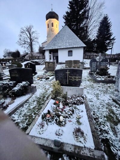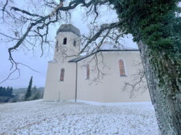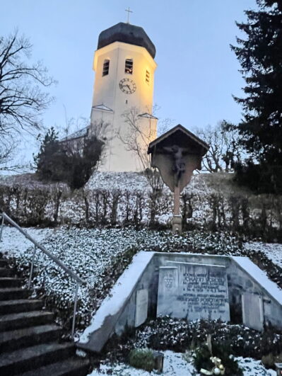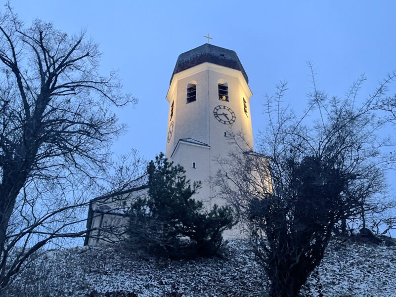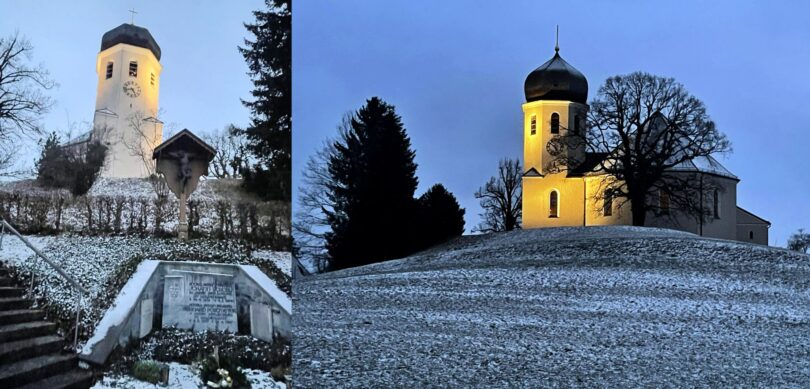 Die 1934 von Kardinal Faulhaber eingeweihte und auf einem Hügel stehende Kirche “Christkönig” von Wildenwart zeigt sich gerade bei einbrechender Dämmerung und Dank einer Anstrahlung in einem besonders schönen Licht.
