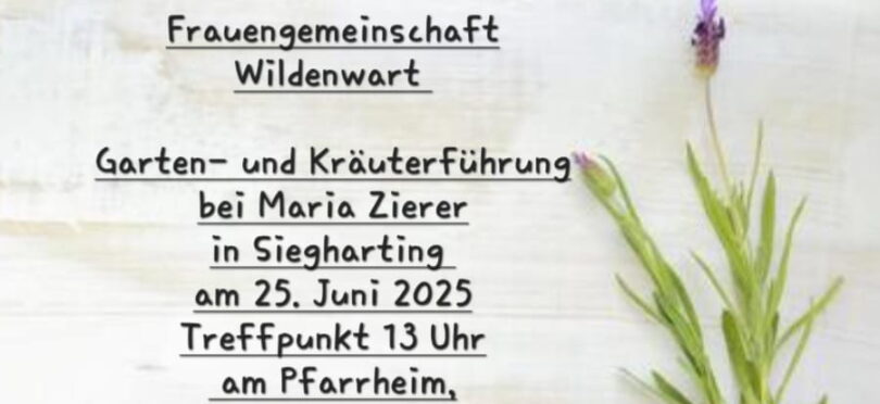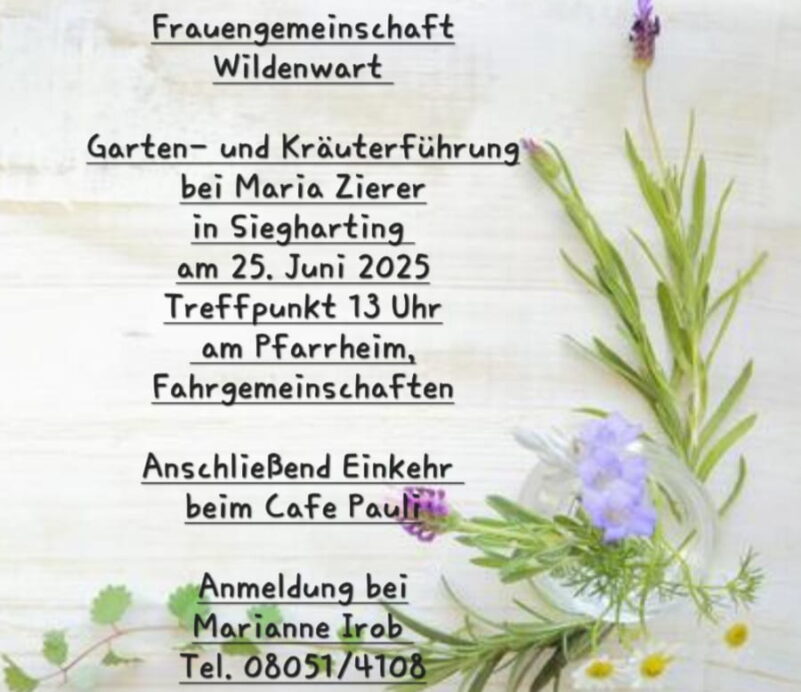 Die Garten- und Kräuterführung beginnt mit dem Treffpunkt um 13 Uhr am Wildenwarter Pfarrheim und mit Fahrgemeinschaften. Nach den Kräutererläuterungen ist noch Einkehr beim Cafe Pauli in Aschau. Anmeldungen zur Teilnahme nimmt Marianne Irob in Prutdorf, Tel. 08051-4108 entgegen.