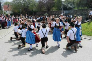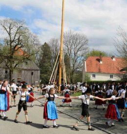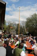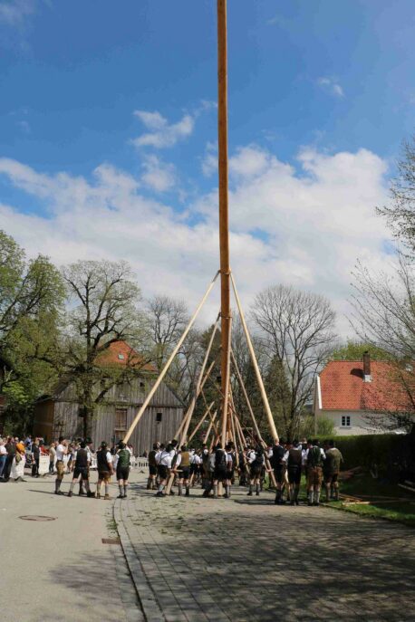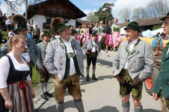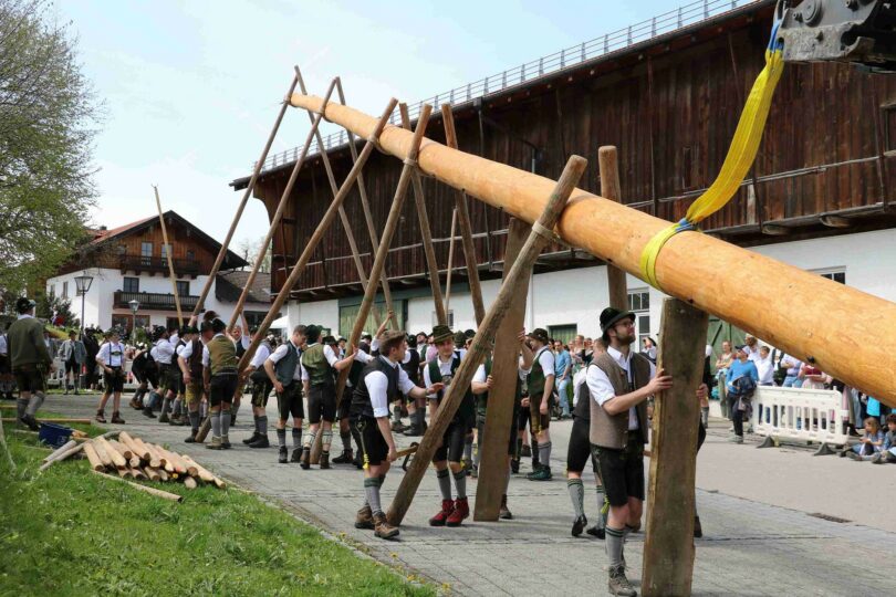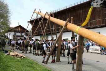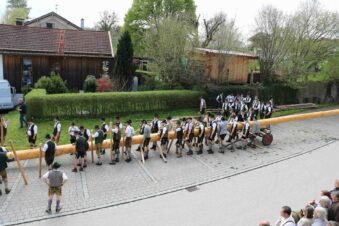 67 Männer der drei Trachtenvereine von Prien, Atzing und Wildenwart stellten den fast drei Tonnen schweren, 28 Meter langen Maibaum vor der Wildenwarter Schlosswirtschaft auf. Erstmals in der Wildenwarter Maibaumgeschichte wurde der neue Maibaum unmittelbar nach dem Fällen in der Deutenau von den beiden Nachbarsvereinen aus Prien und Atzing miteinander „sichergestellt“. Gestiftet wurde der Baum vom Wildenwarter Schlossherrn Herzog Max in Bayern. Die nächsten fünf Jahre wird er im Mittelpunkt des Wildenwarter Dorflebens stehen. Über zwei Stunden harte Arbeit unter der Leitung von Georg Aicher, war notwendig, um den Baumriesen an seinem Platz an der Südseite der Schlosswirtschaft fest zu verankern. Mit Musik, Ross und Wagen, wie es der Brauch verlangt, brachten die beiden Vereine aus der Nachbarschaft den Baum zum Aufstellen nach Wildenwart zurück. Dank des Kaiserwetters gingen die Verhandlungen bei strahlend blauem Himmel zwischen den drei Trachtenvorständen mit Hilfe des Frasdorfer Bürgermeisters Daniel Mair rasch und erfolgreich zu Ende: für eine Maß Bier und eine Brotzeit nach dem Aufstellen und ein paar Maß Wachterbier waren die Atzinger und die Priener bereit, den Baum wieder herzugeben und beim Aufstellen mitzuhelfen. Seit sie den Baum zu Weihnachten miteinander sichergestellt hatten, passten sie auf den Baum auf und bewahrten ihn treulich vor weiteren Diebstählen. Nach getaner Arbeit ließen sich die Aufsteller aus Atzing, Prien und Wildenwart gemeinsam das hart verdiente Bier und die Brotzeit schmecken. Mit ihnen feierten auch die vielen Besucher aus der ganzen Region und freuten sich an den Tänzen der Kindergruppe der Lustigen Wildenwarter.