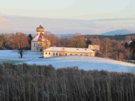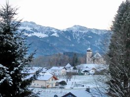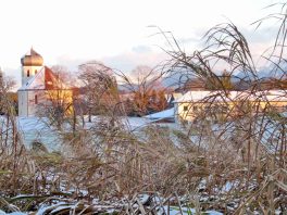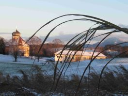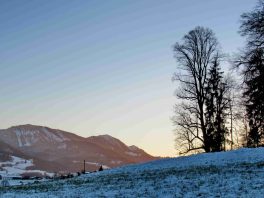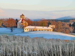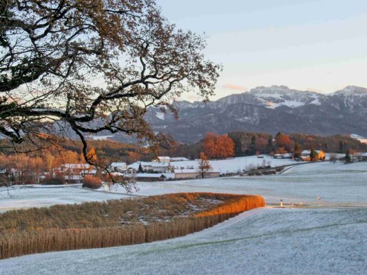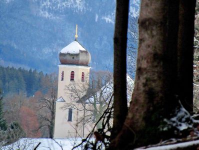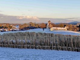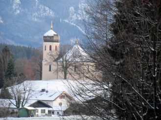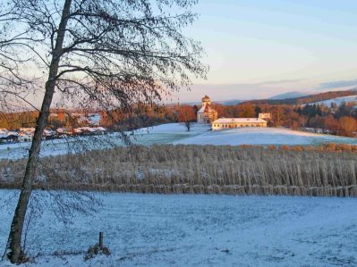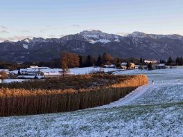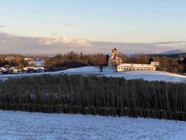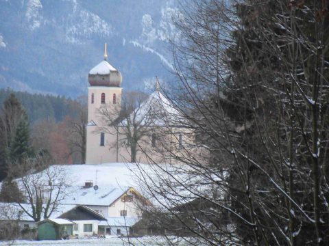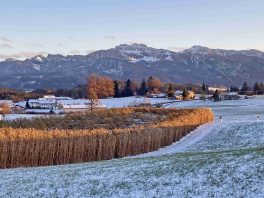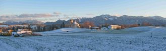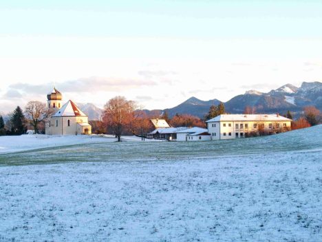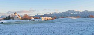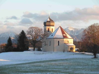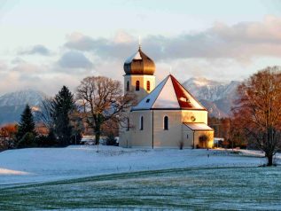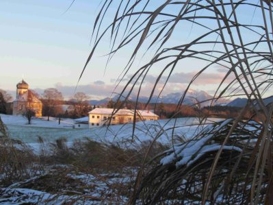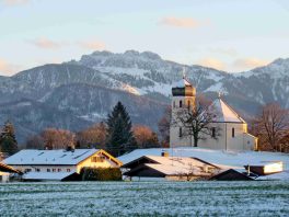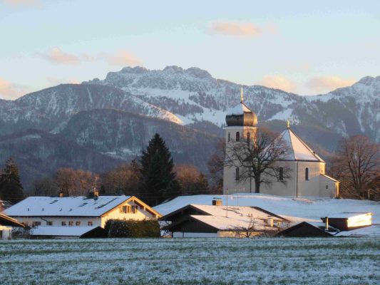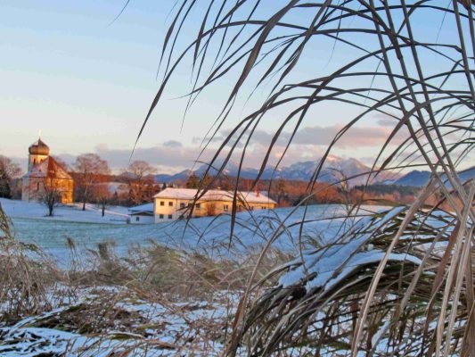Im schönen Advent-Abendlicht zeigt sich die 1934 auf einem Hügel erbaute Pfarrkirche „Christkönig“ von Wildenwart. Die Bilder aus verschiedenen Standorten zeigen die Kirche im schönen Spannungsfeld zwischen einem Elefantengras-Feld und der Chiemgauer Alpenwelt, wobei die Kampenwand der nächste und markanteste Berg ist.