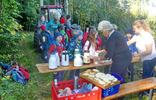 Einmal einen ganzen Unterrichtstag mit dem Jäger und Förster in den Wald gehen – dieser Wunsch wird den Schülerinnen und Schülern der Grundschule Wildenwart (Außenstelle der Franziska-Hager-Grundschule Prien) seit nunmehr 25 Jahren erfüllt. Für diesen Aktionstag, der mit einer Unterrichtsstunde beginnt und der dann in den nahen Wald bei Röselsberg führt, stellten sich auch heuer Jäger Fritz Fuihl und Waldbauer Georg Aicher zur Verfügung. Aufgrund der vielen Jahre gibt es schon einen „Dritte-Klassen-Wald“, denn immer die Dritte Klasse kommt in den Genuss des Waldtages im Rahmen eines Heimat- und Sachkunde-Unterrichts zum Thema „Wald“. An diesem Tage werden den Kindern die verschiedenen Baumarten und Holz-Nutzungen erläutert und sie dürfen auch selbst mit Hand anlegen, wenn neu angepflanzt wird bzw. wenn im Rahmen der Waldpflege Bäume rausgeschnitten werden. „Wir erklären den Kindern, dass man vom Wald nicht nur ernten kann, sondern dass man ihn auch bearbeiten muss, damit nachhaltig gewirtschaftet werden kann“, so Fritz Fuihl. Nicht nur die Kinder, sondern auch die Klassenlehrerin Sonja Bestvater-Gottfried war begeistert vom Lernprogramm im Wald, das mit einem kleinen Sägewettbewerb noch spielerisch das Interesse der Dirndl und Buam am Umgang mit dem Holz fand. Darüber hinaus sorgten Sieglinde Fuihl und Irmi Aicher mit Honigbroten und Lindenblütentee für zusätzliche Informationen und Eindrücke vom und im Wald.