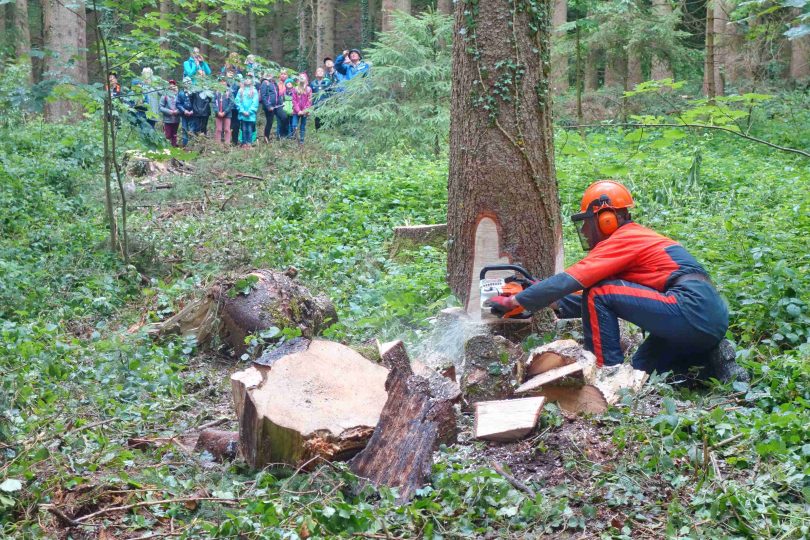 Fotos: Hötzelsperger – Eindrücke vom Wald-Unterricht der Dritten Schulklasse von Wildenwart – Fällung einer Fichte durch Georg Aicher – er zeigt auf die Anzeichen des Borkenkäfers.