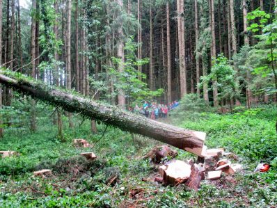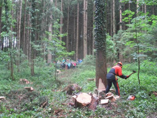 Ein gewaltiges Erlebnis war die Fällung einer Fichte, die vom Borkenkäfer befallen war. Dazu erklärte der Förster vor dem Umschneiden: „Der Borkenkäfer bohrt sich in die Rinde, wenn der Baum gesund ist, kann er sich mit seinem Wachs wehren. Wenn er aber zu wenig Wasser hat und durch die Trockenheit geschwächt ist, dann hat der Käfer leichtes Spiel. Der Borkenkäfer legt Eier, die Larven fressen unter der Rinde, so dass der Saftfluss unterbrochen ist und der Baum abstirbt“. In seinen weiteren Erklärungen sagte Georg Aicher, dass der fertige Käfer nicht weit fliegen will und schnell die benachbarten Bäume befällt, die dann ebenfalls absterben. Deswegen ist es wichtig, dass die Waldbesitzer ihren Baumbestand ständig kontrollieren und bei Käferbefall reagieren. Interessiert verfolgten die Dirndl und Buam –mit reichlich Sicherheitsabstand- die perfekte Baumfällung, anschließend nahmen sie mit Jäger Fritz Fuihl die Zählung der Jahresringe vor. „Dieser Baum war erst 60 Jahre alt und musste umgeschnitten werden, oft werden die Bäume aber doppelt so alt und noch älter“ – so Fritz Fuihl, der mit seiner Frau Sieglinde zum Abschluss noch für jede Schülerin und jeden Schüler ein Eis und Getränke parat hatte. „Das war heute ein schöner Unterricht, der Dritte-Klasse-Wald ist so richtig erstklassig“ – so das einstimmige Urteil vor dem Rückmarsch zur Schule.