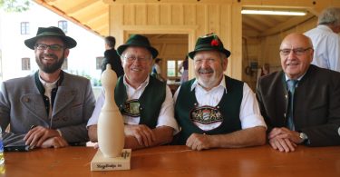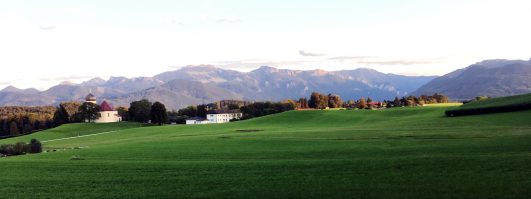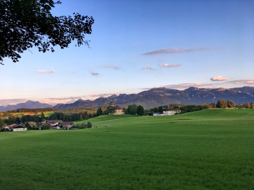 Die Pfarrkirche “Christkönig” und die Chiemgauer Bergwelt bieten zu allen Jahreszeiten ein imponierendes Landschaftsbild – so auch in diesen Spätsommertagen am zu Ende gehenden Tag.