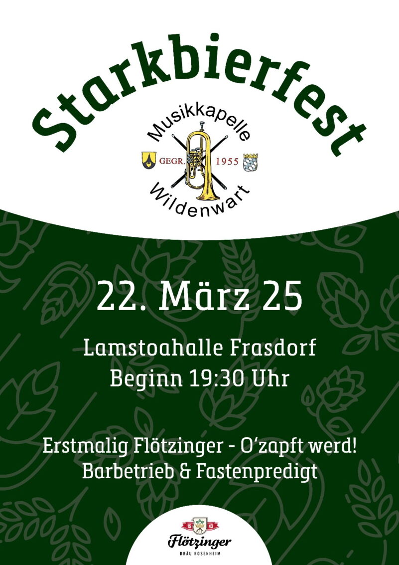 „Starkes Bier, starke Sprüche und starke Veränderungen“ – all das wird es beim traditionellen Starkbierfest der Musikkapelle Wildenwart am Samstag, 22. März in der Lamstoahalle von Frasdorf geben. Das Starkbierfest gilt als Auftakt des Jubiläums „70 Jahre Musikkapelle Wildenwart“, das mit Festtagen vom Freitag, 16. Mai bis Sonntag, 18. Mai auf dem Braunhof in Stupfa noch gesondert gefeiert werden wird.