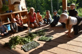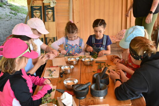 Irmi Klauser und ihre Kolleginnen Kathi Weiser und Lina Heinzig hatten schon Wildpflanzen aus dem Wald zusammengetragen und getrocknet. Die wurden jetzt den Kindern gezeigt und sie sollten berichten, welche ihnen bekannt sind. Erstaunlich viele konnten identifiziert werden, von der Brennnessel, Spitzwegerich, Klee, Schafgarbe, Katzenminze bis zum Giersch. Einzeln wurden die Pflanzen von Hand zu Hand gereicht.