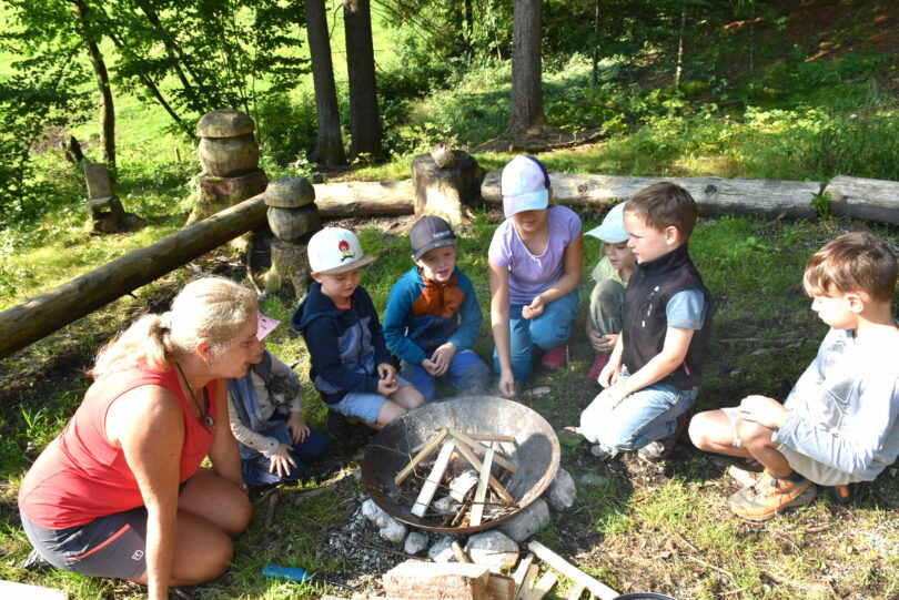 Kochen in der Wildnis – geht das? Das fragten sich die rund zwanzig Kinder, die zum Ferienprogramm zu Besuch im Waldkindergarten waren. Gemütlich saßen die Kinder zwischen 3 und 9 Jahren erstmal im Kreis für die Vorstellungsrunde.