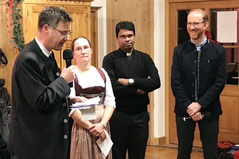 Im Rahmen des diesjährigen Bernauer Pfarrfamilienabends (wir berichteten) konnte Pfarrer Klaus Hofstetter (Foto, rechts) den Anwesenden eine freudige Mitteilung machen. Nach der Pensionierung von Pastoralreferentin Edith Heindl und dem Weggang Kaplan Stefan Leitenbachers hat das Ordinariat München dem Pfarrverband Westliches Chiemseeufer einen neuen priesterlichen Mitarbeiter zugewiesen. Seit 2. Januar ist Pater Benny Karickamukatel in Prien. Er kommt – wie sein Kollege Pater Joshy – aus dem Bundesstaat Kerala im Südwesten Indiens und ist Bruder der „Missionsgesellschaft vom heiligen Thomas“. In seiner kurzen Vorstellung berichtete P. Benny, dass er letztes Jahr er sein silbernes Priesterjubiläum feiern konnte und nun zum zweiten Mal eine Stelle in Deutschland antritt. Von 2001 bis 2012 war er bereits Pfarrer in der Diözese Eichstätt, wurde dann aber von seinem Orden wieder in den Norden von Indien zurückberufen. Er habe sich sehr gefreut, dass ihn sein Ordensprovinzial nun wieder nach Deutschland geschickt habe zusammen mit einem indischen Mitbruder, der im Inntal eingesetzt sei. Pfarrgemeinderatsvorsitzender Gregor Thalhammer, Gemeindeleiterin Conny Gaiser (Foto von links) und die Anwesenden hießen ihn herzlich in Bernau willkommen.