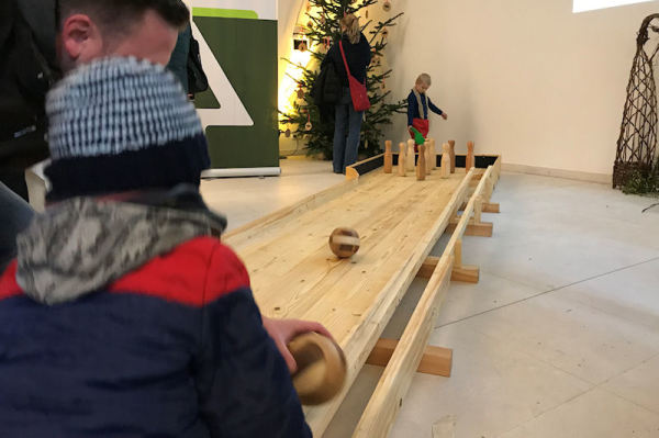 Die Kinder haben Spaß mit der Holzkegelbahn.